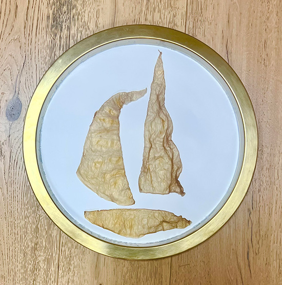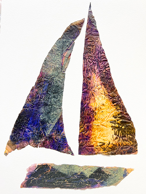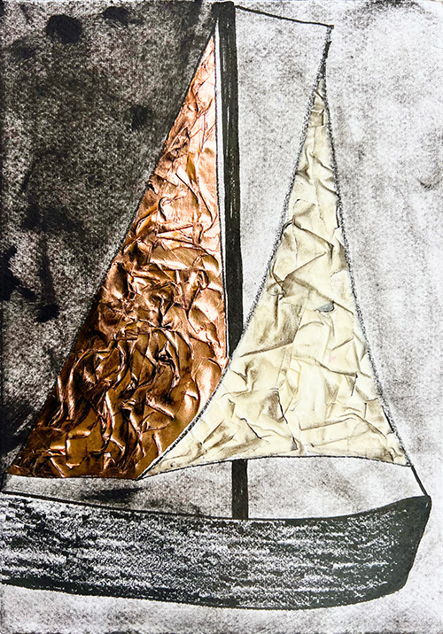 In the "Liminality" series, sailboats emerge as a central motif. Crafted from delicate paper or painted with translucent nuances, Hadas' boats epitomize fragility and freedom. Their components flutter side by side, forming a cohesive yet delicate whole. This boat imagery holds an enigmatic quality, detached from water, rising and falling on the waves of time, in between origin and destination, between the past and the future, between the sky and the sea.
